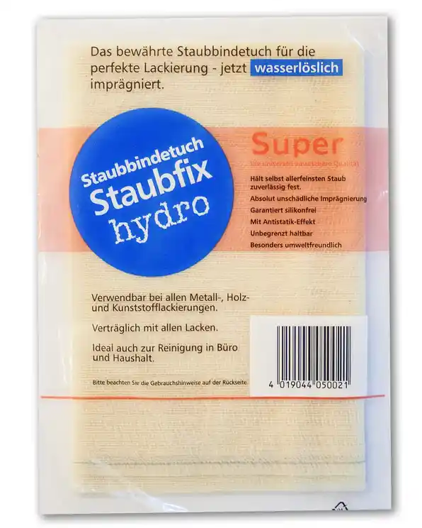Das patentierte Staubfix hydro weist eine einzigartige wasserlösliche Imprägnierung auf. Eventuelle Rückstände lassen sich einfach mit Wasser entfernen. Das vereinfacht die Handhabung und spart Lösemittel.